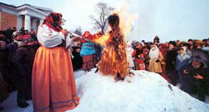 Например, масленица. Это древнейший праздник, во время которого, когда это был чистый ритуал, убивали человека, убивали жестоко и страшно, фактически разрывали на части живую человеческую плоть и эту плоть разбрасывали по полям. Этот человек был как бы представителем божества плодородия, для этого на него надевали венок ? знак жертвы, и он своим телом как бы оплодотворял землю. Конечно же, в XVII, XVIII, XIX веках уже никого не убивали. Там было чучело. Но это чучело имело имя, оно было одето, оно имело женский облик, правда, оно было набито соломой, т.е. тем, что должно произрасти вновь. Сначала идет прославление, потому что это как бы бог плодородия, дух хлеба, потом ? издевательство и осмеяние, потом ? разрывание и убиение, потом оживление. Поют песни, например: А мы Масленицу разорвали, В ямку закопали, Лежи, Масленица, до налетья. Это мотив оживления.